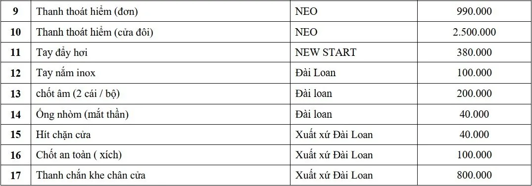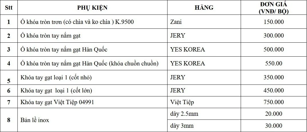 BẢNG GIÁ PHỤ KIỆN KING DOOR